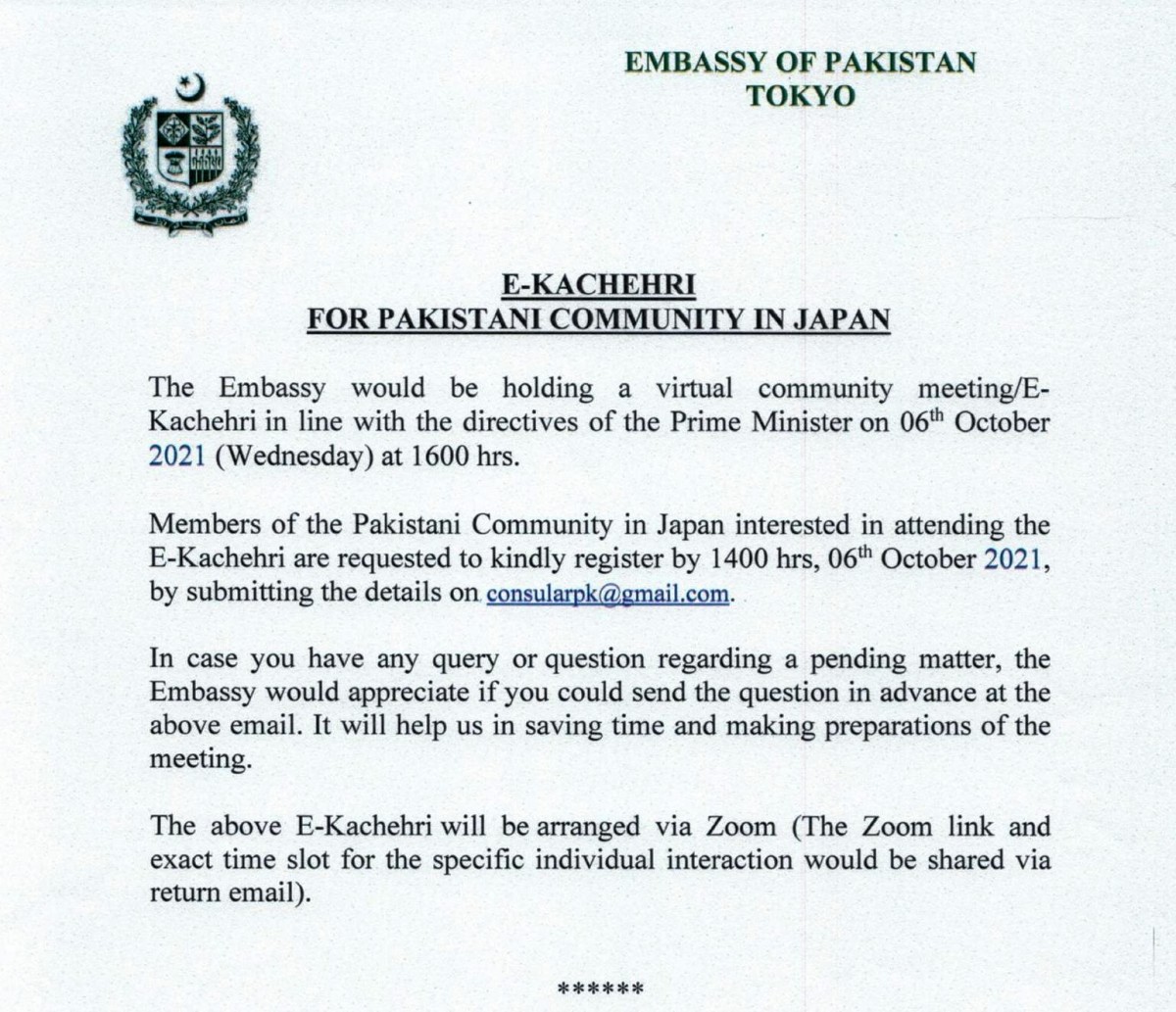 Registration of Pakistani Nationals with Pakistan Embassy (Japan)