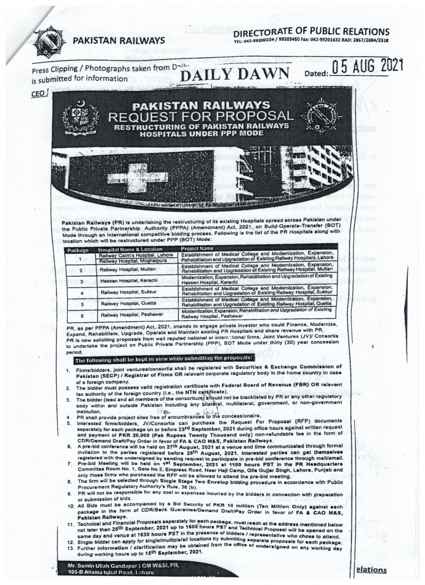 Request for Proposal: Restructuring of Pakistan Railways Hospitals under Public Private Partnership