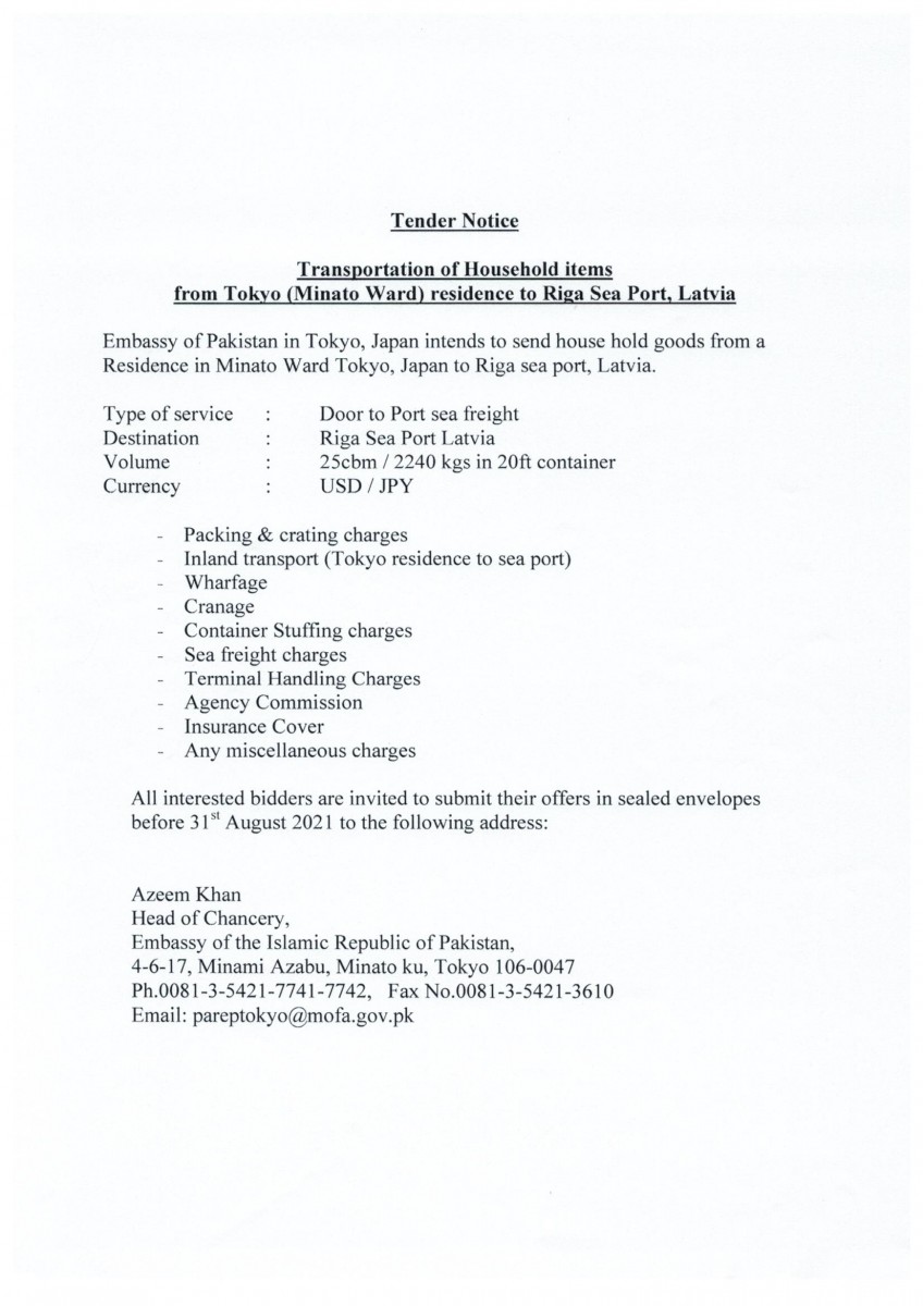 Tender Notice: Transportation of Household Items from Tokyo to Riga Sea Port, Latvia