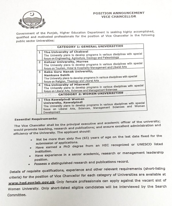Vacancy for position of Vice Chancellor in the public sector Universities of Punjab