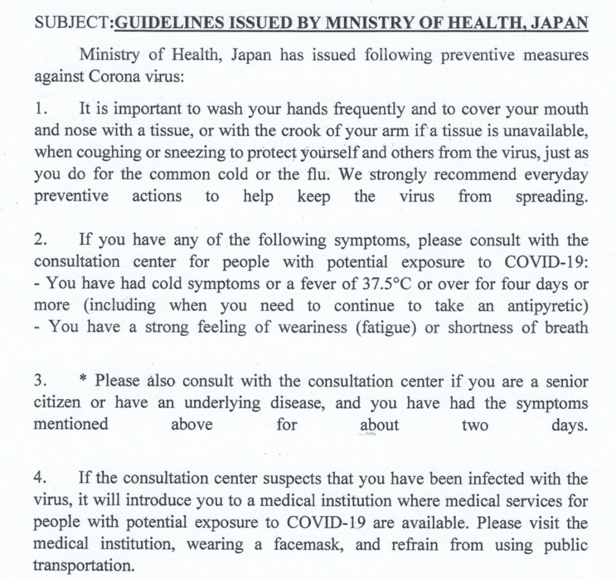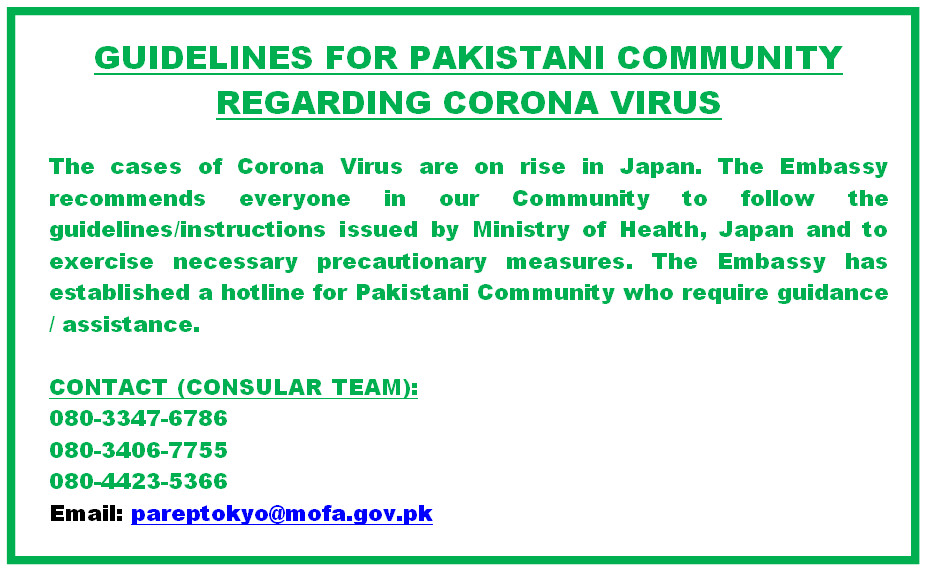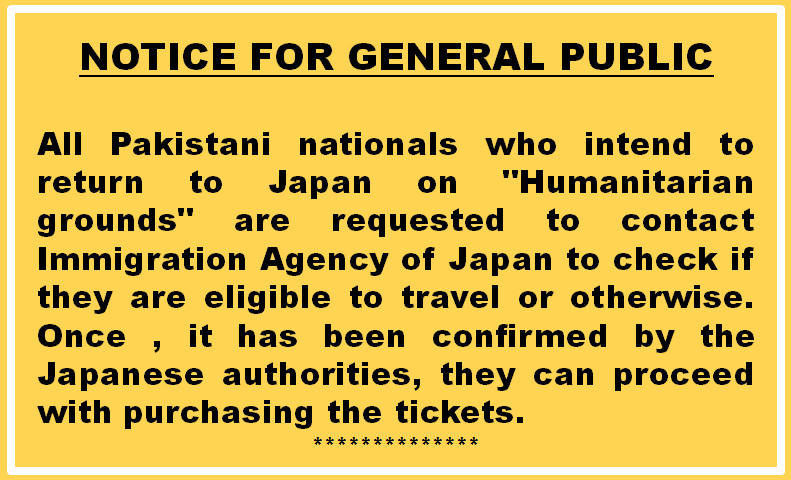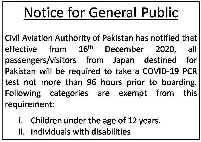 It is to inform all Pakistani citizens residing or travelling from Japan that the Aviation Division of Pakistan has issued a travel advisory to Pakistan announcing suspension of all international passenger, chartered and private flights to Pakistan effect